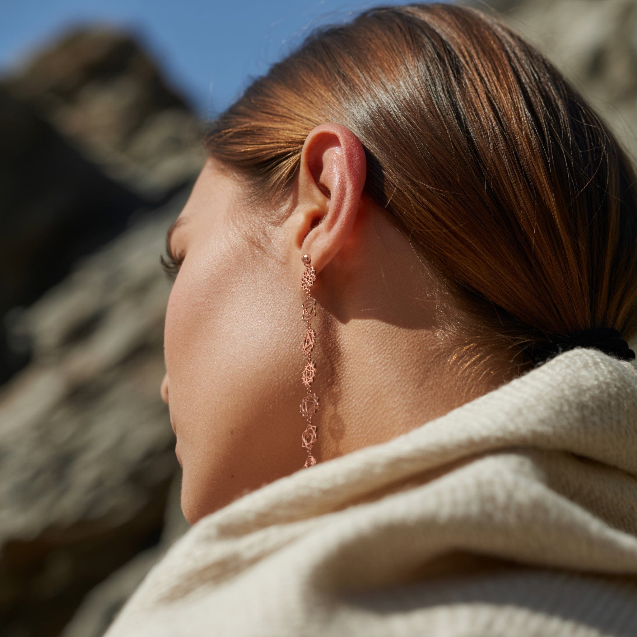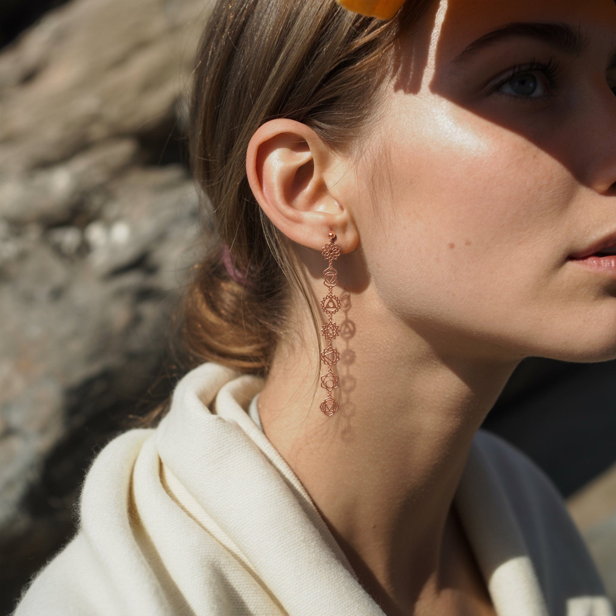 Our 7-Chakra Earrings are a bridge to your inner divine. Crafted in 14k rose gold, they showcase the vibrant symbols of your chakras. Lightweight yet radiant, these earrings offer comfort and a dash of sparkle, empowering you to shine from within.