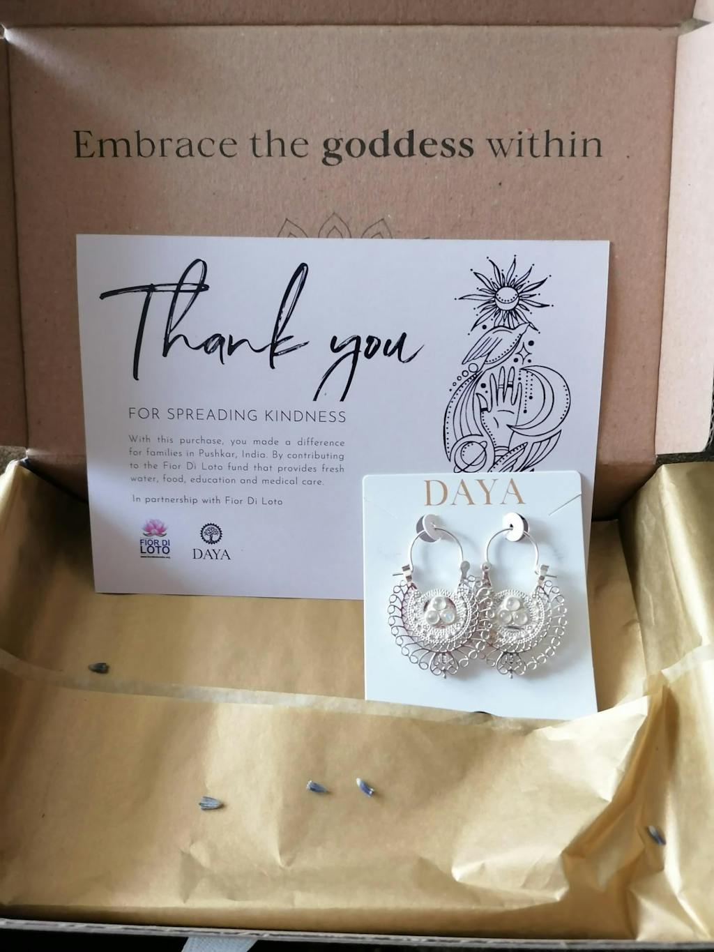 - Your Daya jewelry arrives in a stunning, eco-friendly package that's ready to gift. We believe that the unboxing experience should be just as special as the jewelry itself, reflecting the love and care you've put into choosing the perfect piece.