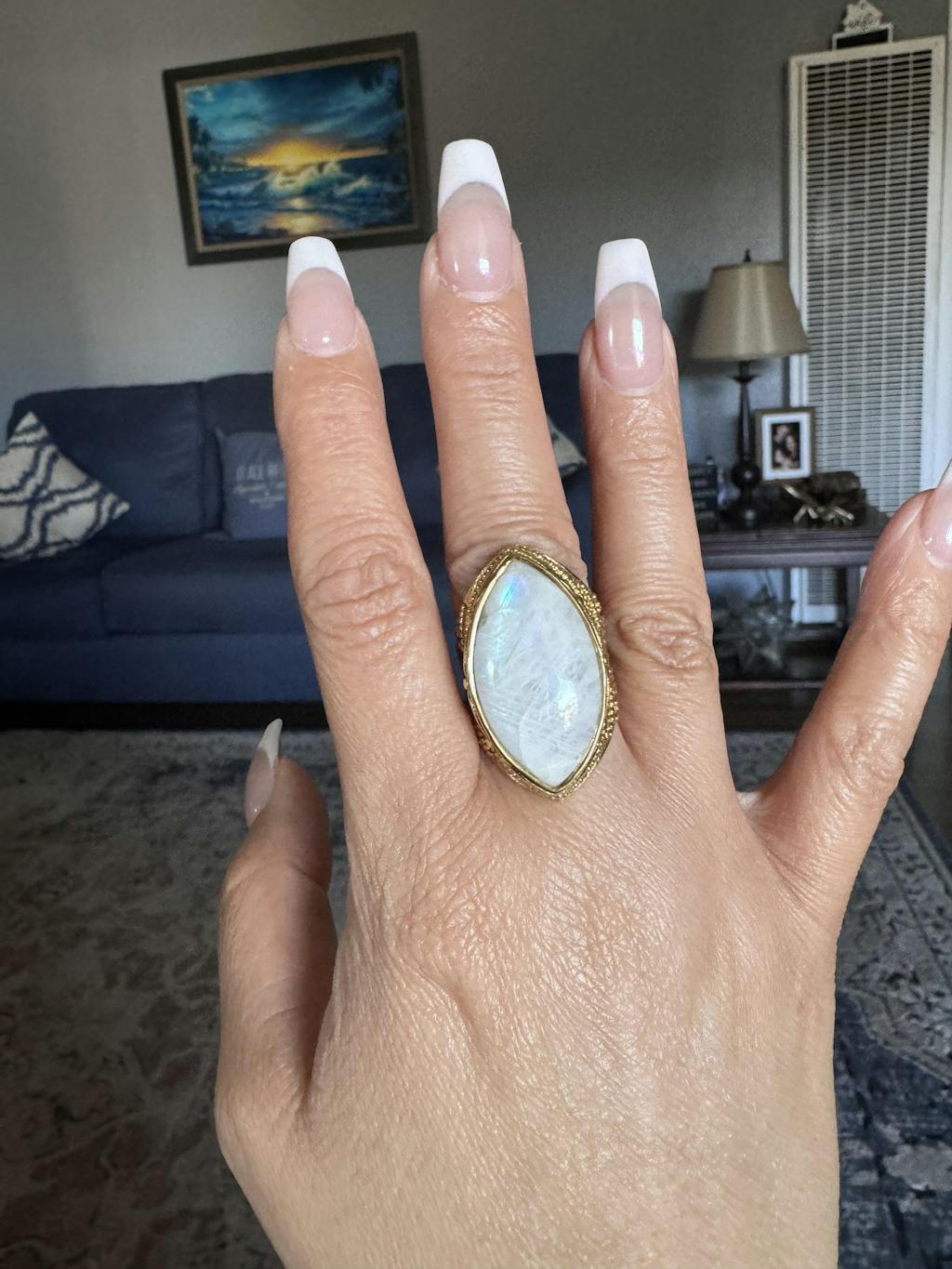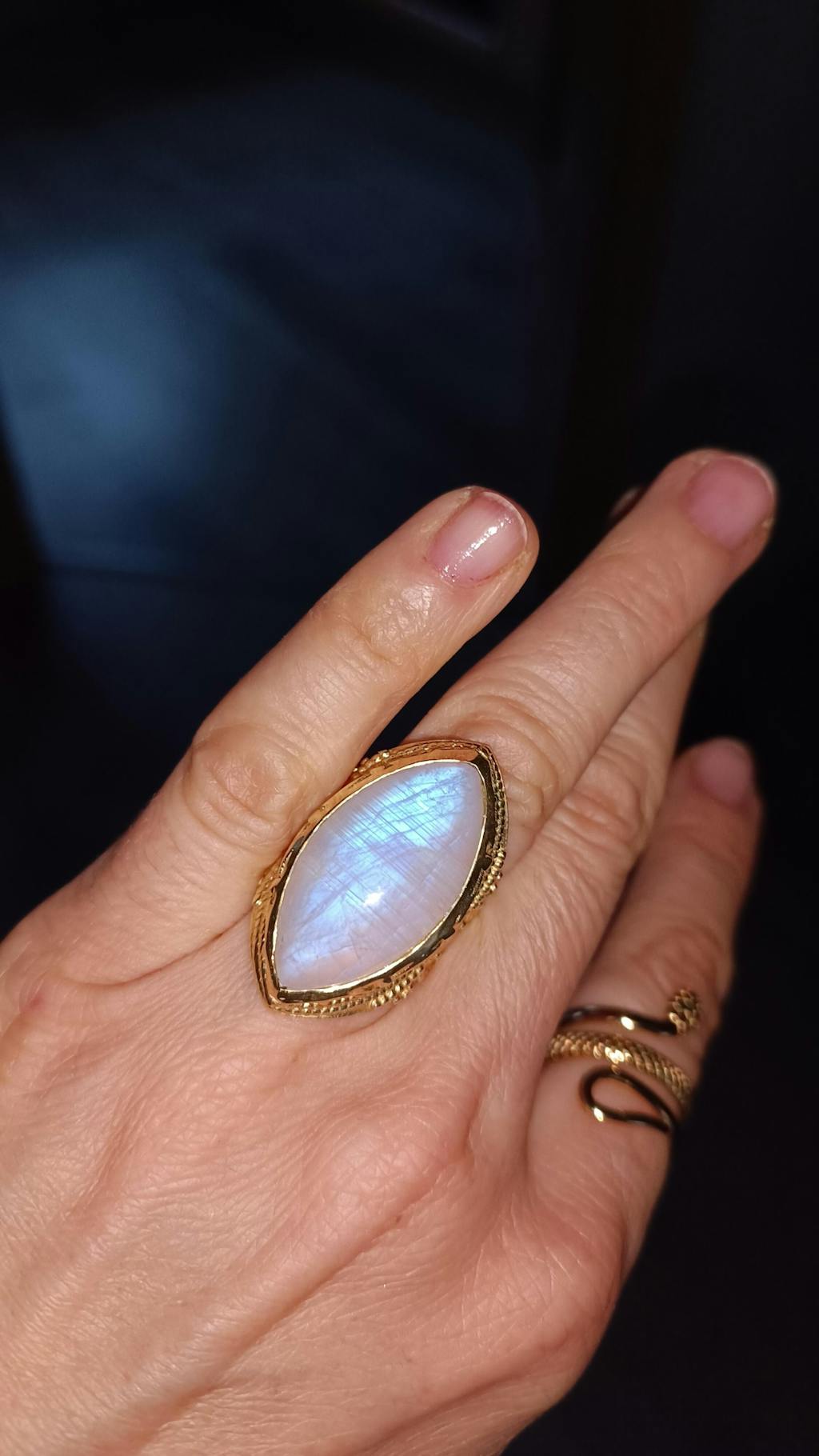 The Aryia Ring is a truly special piece of jewelry imbued with the noble qualities of its Sanskrit name. Crafted with a beautiful, shiny Moonstone crystal, this stone is known for its connection to the divine feminine, enhancing intuition and bringing a sense of calm. Perfectly blending elegance and spiritual meaning, the Aryia Ring celebrates the essence of femininity.
