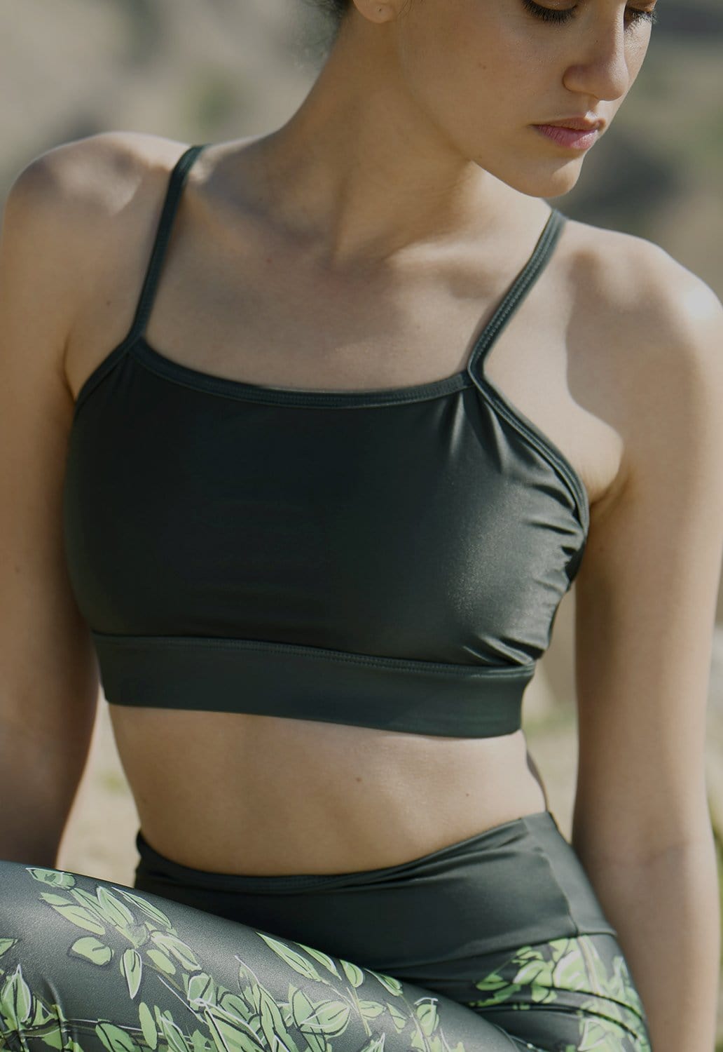 The refined design features thin, feminine straps and a delicate cut-out design on the back. The solid elastic bottom provides extra support and is complemented by an earthy green color.